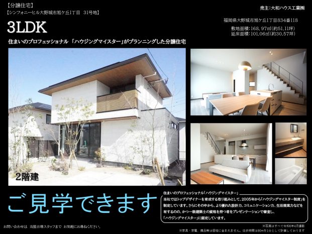 大野城市旭が丘に当社のトップデザイナーがプランニングした新築戸建3棟が完成。一級建築士の中でもさらに認定を受けたハウジングマイスター3名が各々の思いを各邸宅に詰め込んでいる見応えある住まいです。人生に一度の大きな買い物、マイホームの検討前にはぜひご見学を(^^)ダイワハウスをご覧になるのが初めての方対象で、Amazonギフト券3,000円分をプレゼント!下記へのご予約優先です。
