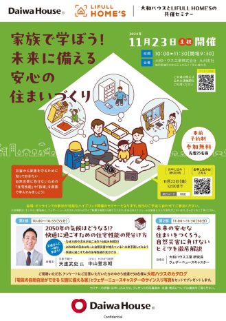 ご自宅にいながら、大事なマイホーム、災害から家族を守るために知っておきたい、自然災害に負けないための「住宅性能」や「技術」を家族で学べますよ。(11:00~11:30)