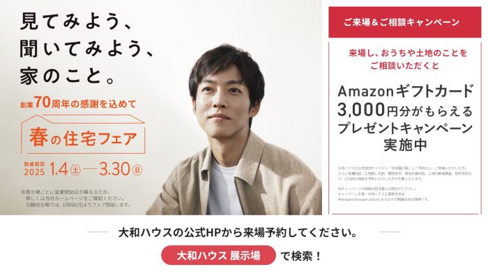 春フェア住宅実施。2025年4月に70周年を迎えるダイワハウス。日頃の感謝を込めて、WEBにてご予約下さいましたご見学者様を対象にAmazonギフト券3000円分がもらえるプレゼント企画を実施中。(ご来場後、次にお会いする日が決まっている方で、後日お渡しとなります)詳しくは当展示場までお尋ねください。