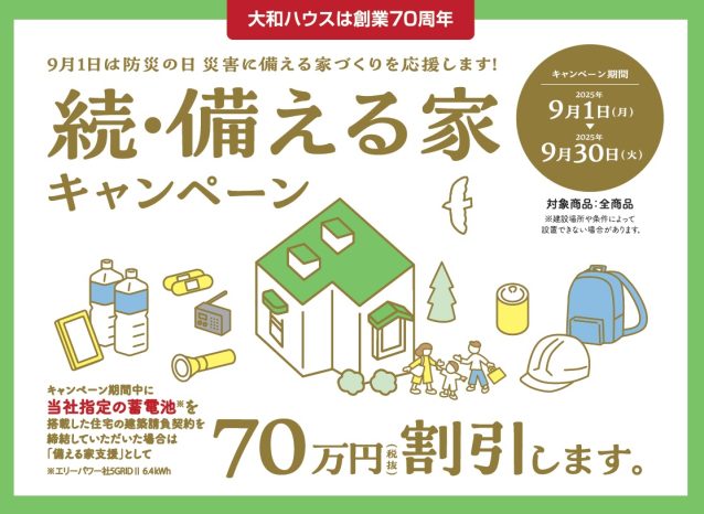 期間中に当社指定の蓄電池を搭載した住宅の建築請負契約を締結して頂いた場合は「備える家支援」として70万円(税抜)割引します。