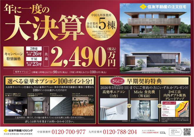 2026年3月31日(火)までにご契約、かつ2026年12月31日(木)までにお引き渡し可能な方へ、キャンペーン特別価格をご用意いたしました。