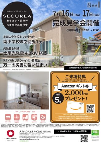 期間中のご来場特典で、Amazonギフト券2,000円分プレゼント!ご予約受付はダイワハウス久留米hit展示場の来場予約からお進みください。★ダイワハウスに初めてご来場の方で、当日アンケートにご回答いただける方。その他注意事項がございます。詳細は添付のご案内資料をご確認ください。【ご予約受付URL】https://www.daiwahouse.co.jp/kyoten/regist_tenji.asp?c_kind=1041