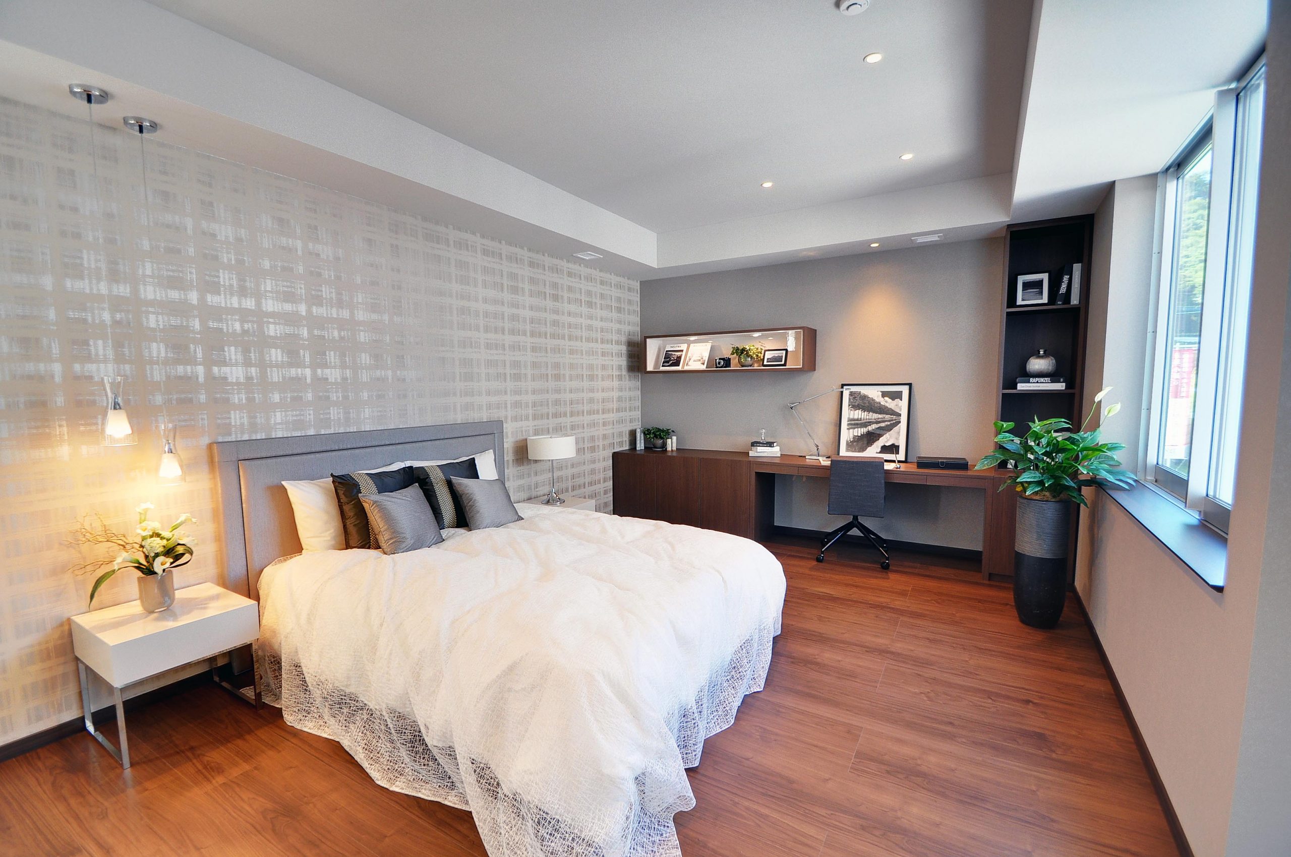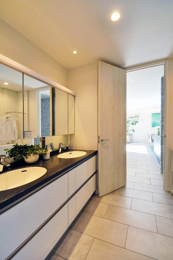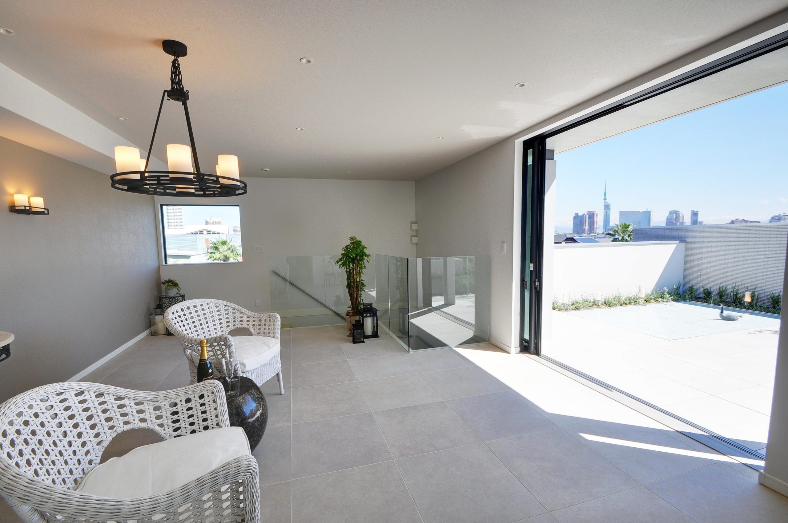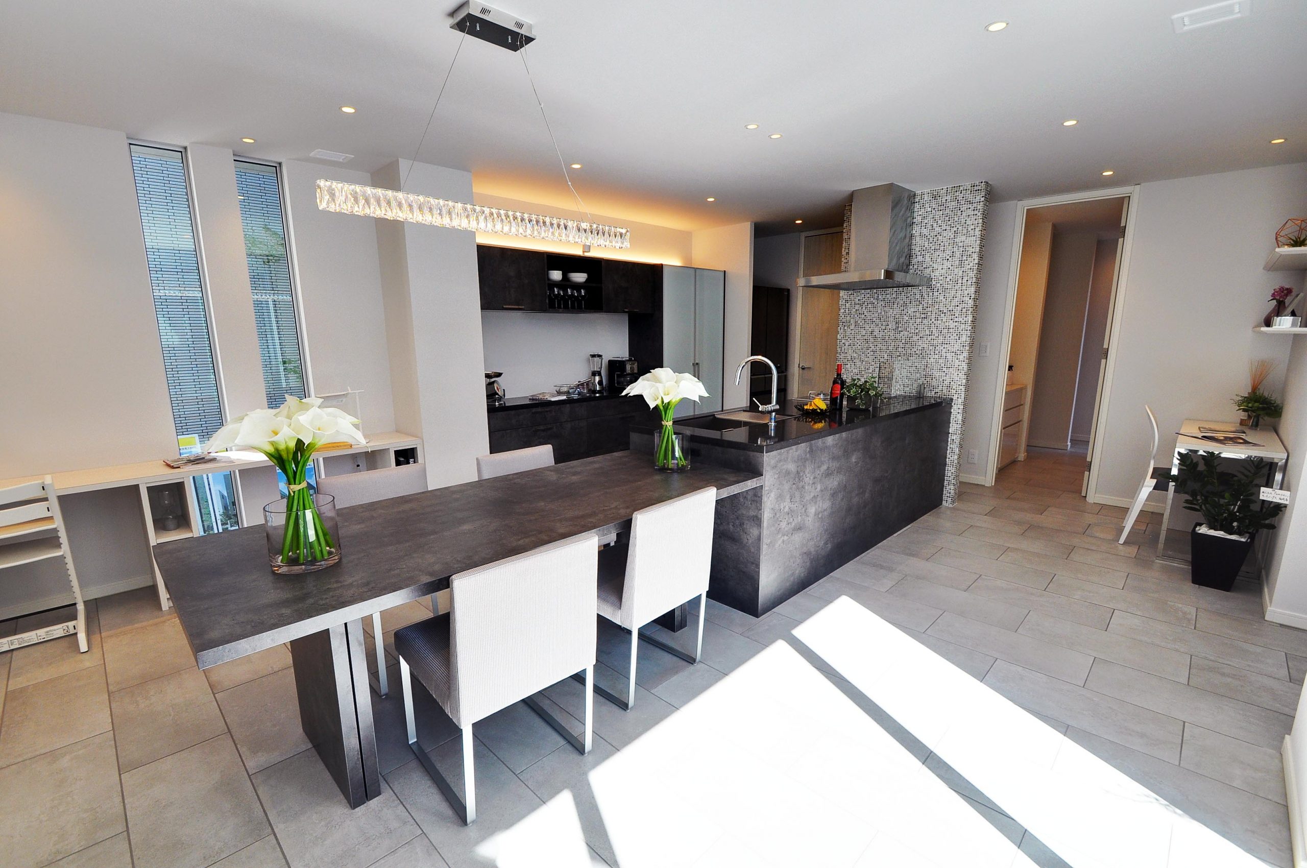 都市と融合するシャープかつ洗練された外観。プライベートパティオが創り出す、広がりある室内空間が魅力。外に閉じたデザインでも開放的で明るい空間を実現。