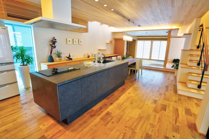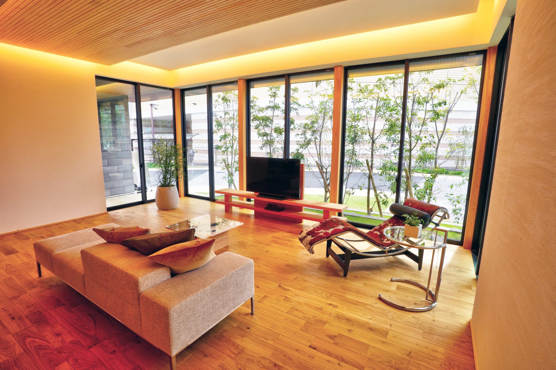 「厳選した自然素材」を生かす設計力と匠の技を表現しています。家族やペットをつつみこんでくれる檜の香りとともに、音楽を楽しむリビングとなっています。