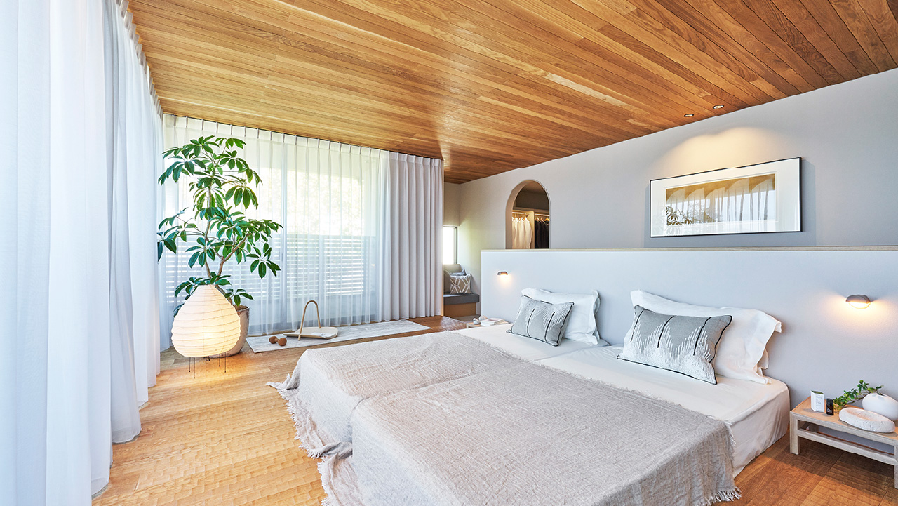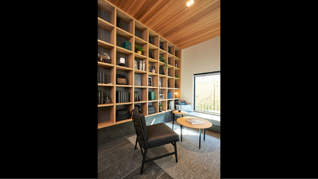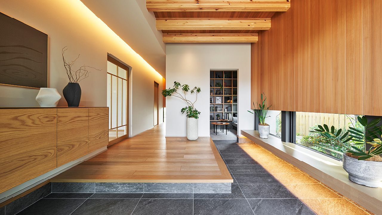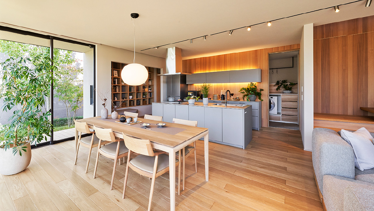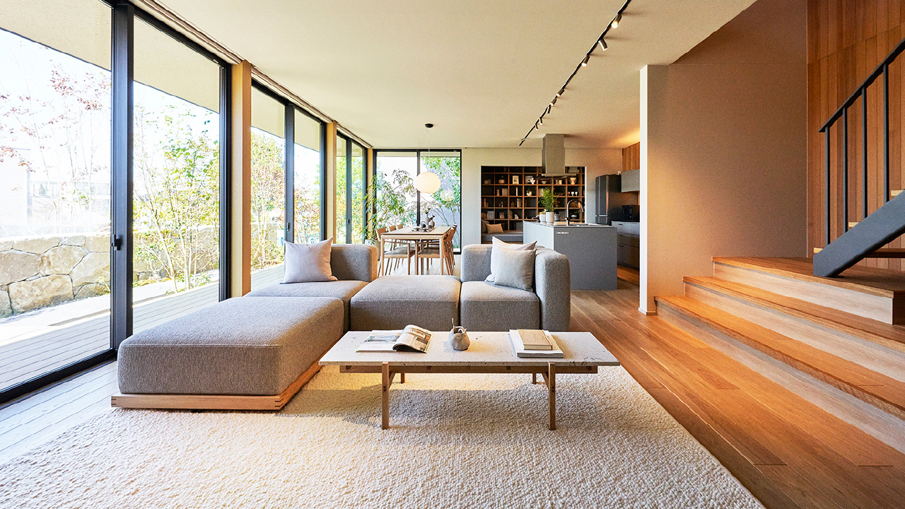 シンプルな一枚の寄棟屋根とオーバーハングしたバルコニー下の箱庇により美しい2本の水平ラインが演出されています。内装は天然木とニュアンスカラーの組み合わせで温かみのあるデザインとしました。