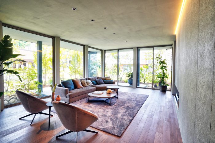 都市と融合するシャープかつ洗練された外観。プライベートパティオが創り出す、広がりある室内空間が魅力。外に閉じたデザインでも開放的で明るい空間を実現。