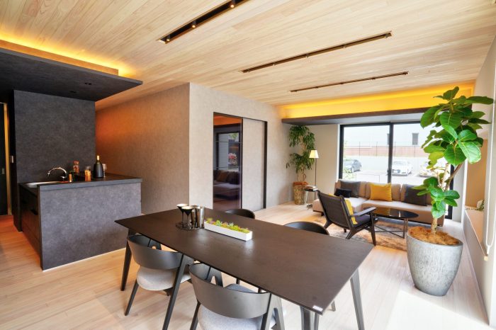 リビングまわりは、吹き抜けや大きな窓のフラットアウト設計で開放的な空間に仕上げつつ、足元の段差、そして背の高い書棚で立体的な飽きのこないレイアウト。 キッチンダイニングは、流しとダイニングテーブルが一直線で、家族一緒の楽しいお料理作りが目に浮かぶようです。 そしてガラスで仕切られたサニタリースペースは、その奥では小さなお庭につながっており、浴槽奥の窓を開け放つととても開放的な空間でバスタイムを楽しめつつ、洗濯物の出し入れもしやすい家事動線となります。 いたる所に暮らしの楽しさを詰め込んだモデルルーム。ぜひ一度ご来場ください。