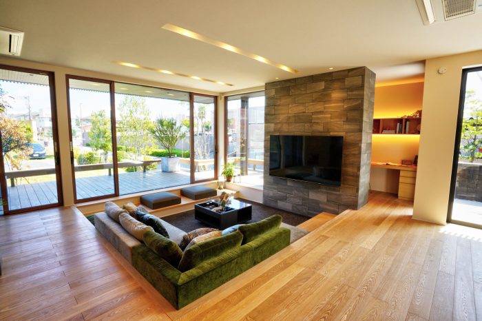 大空間のリビングはコーナーの大開口を通して差し込む光が心地よい、家族のくつろぎの場として至福の居心地と心安らぐ団らん空間を演出します。