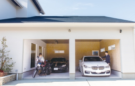 趣味のマイカー2台やビッグバイクを収め、家の中からも様子を眺められるビルトインガレージが「最大のこだわりで大満足の出来栄え」とAさん夫妻。