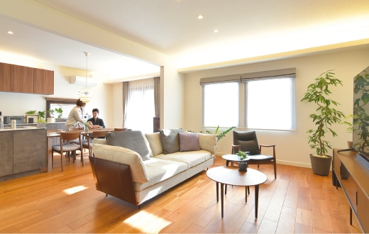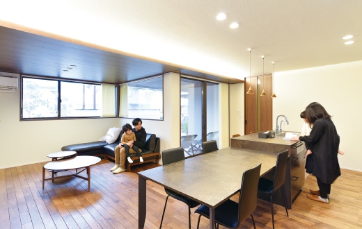 ウォルナットの無垢床材が印象的なLDK。テーブルやソファなどインテリアも同素材でそろえ「おしゃれな店やホテルのような、ちょっと非日常感のある雰囲気にしました」とA夫妻。