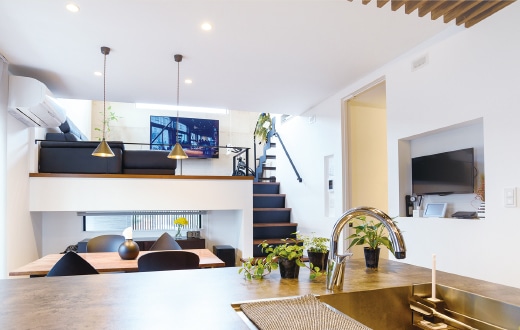 「どこにいても家族を身近に感じられる住まいに」というA夫妻のリクエストに応えた「中2階」のある家。