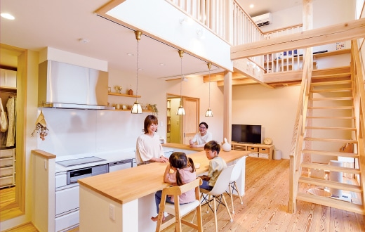 木のふくよかな香りが迎えるBさん邸。吹き抜けリビング、キッチンカウンター、階段など九州産天然乾燥無垢の木が印象的。